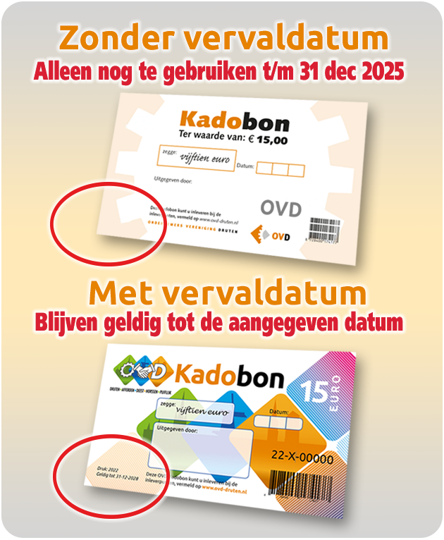 De oude OVD Kadobon is uitgegeven zonder daarbij een geldigheidsdatum te geven (zie foto links). Dit betekent dat de OVD grote reserves moet aanhouden voor met name oude bonnen die naar alle waarschijnlijkheid nooit meer terug komen. Om dit probleem op te lossen heeft de OVD besloten om alle Kadobonnen te voorzien van een geldigheidsdatum. Deze staat op de voorzijde van de bon links onder in de hoek (dit wordt ook nog uitgelegd op de onderstaande foto, rode stip nr. 3).