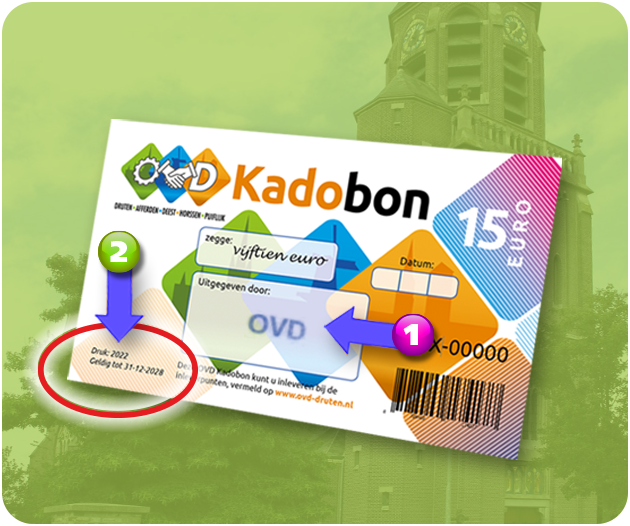 De oude OVD Kadobon is uitgegeven zonder daarbij een geldigheidsdatum te geven (zie foto links). Dit betekent dat de OVD grote reserves moet aanhouden voor met name oude bonnen die naar alle waarschijnlijkheid nooit meer terug komen. Om dit probleem op te lossen heeft de OVD besloten om alle Kadobonnen te voorzien van een geldigheidsdatum. Deze staat op de voorzijde van de bon links onder in de hoek (dit wordt ook nog uitgelegd op de eerste bovenstaande foto, groene stip nr. 2).